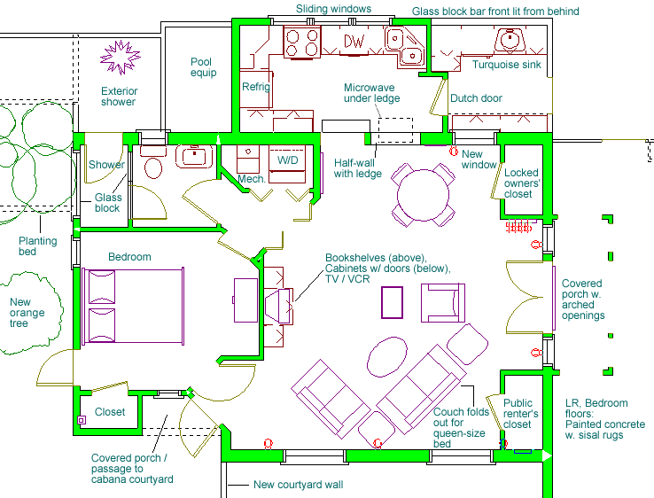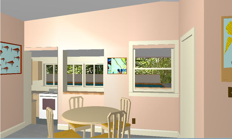 Same spot, but turned to the right and looking past eating area toward the kitchen and outdoor bar Note updated & more accurate view of kitchen, below | |