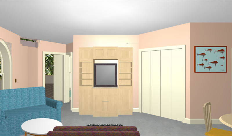 Just inside secondary entrance to living room from new courtyard (entrance between living area and bedroom door), looking toward main entrance (the entrance from existing courtyard) and eating area (zebra-print ottoman not final) | |